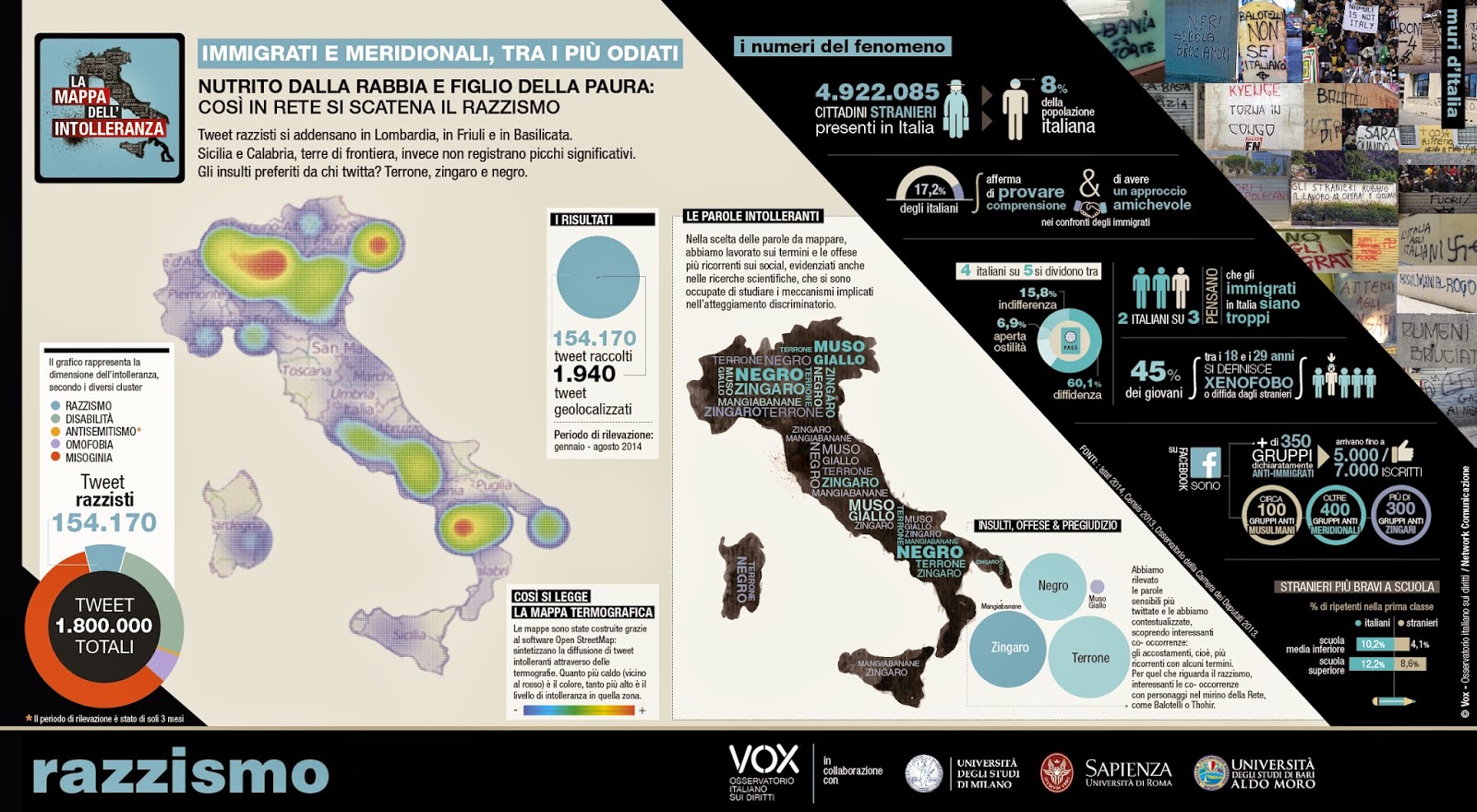 L’associazione Vox – Osservatorio italiano sui diritti, ispirandosi ad un analogo lavoro condotto dalla Humboldt State University della California , che cerca di misurare attraverso la terminologia veicolata dai tweet negli Stati Uniti il livello di intolleranza espresso dal paese, ha monitorato il social per otto mesi, studiando quasi due milioni di cinguettii insieme alle università di Milano, Roma e Bari.